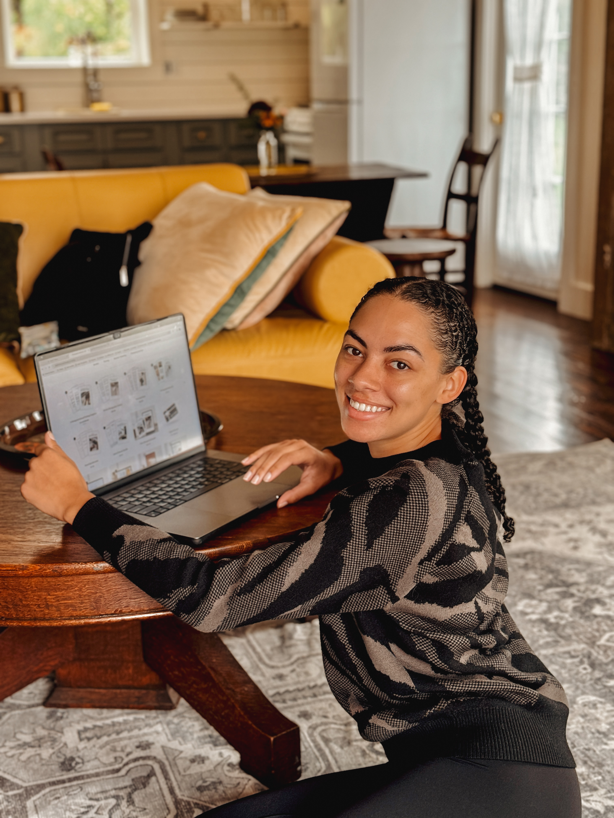 A woman sitting at a wooden table with a camera, stacks of books, and a laptop, smiling and resting her head on her hand indoors with plants and framed artwork in the background.